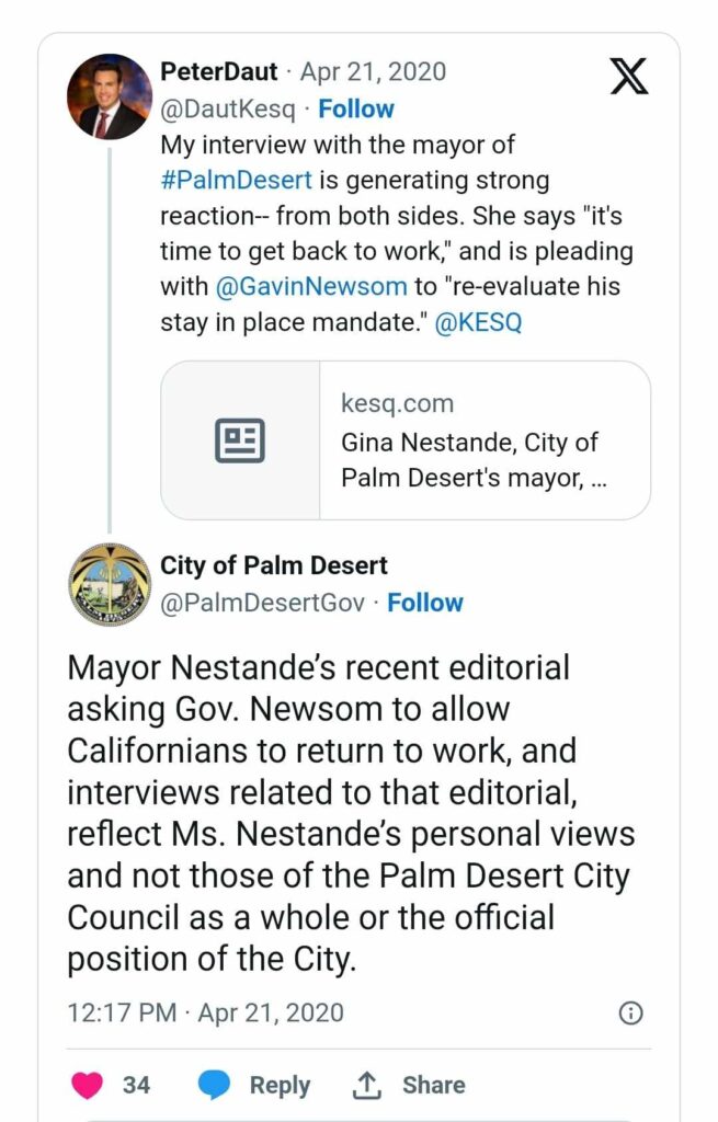 The City of Palm Desert made a rare formal statement that Mayor Nestande did not represent the official position of the city. Here, Nestande explains why she dismisses competent experts.